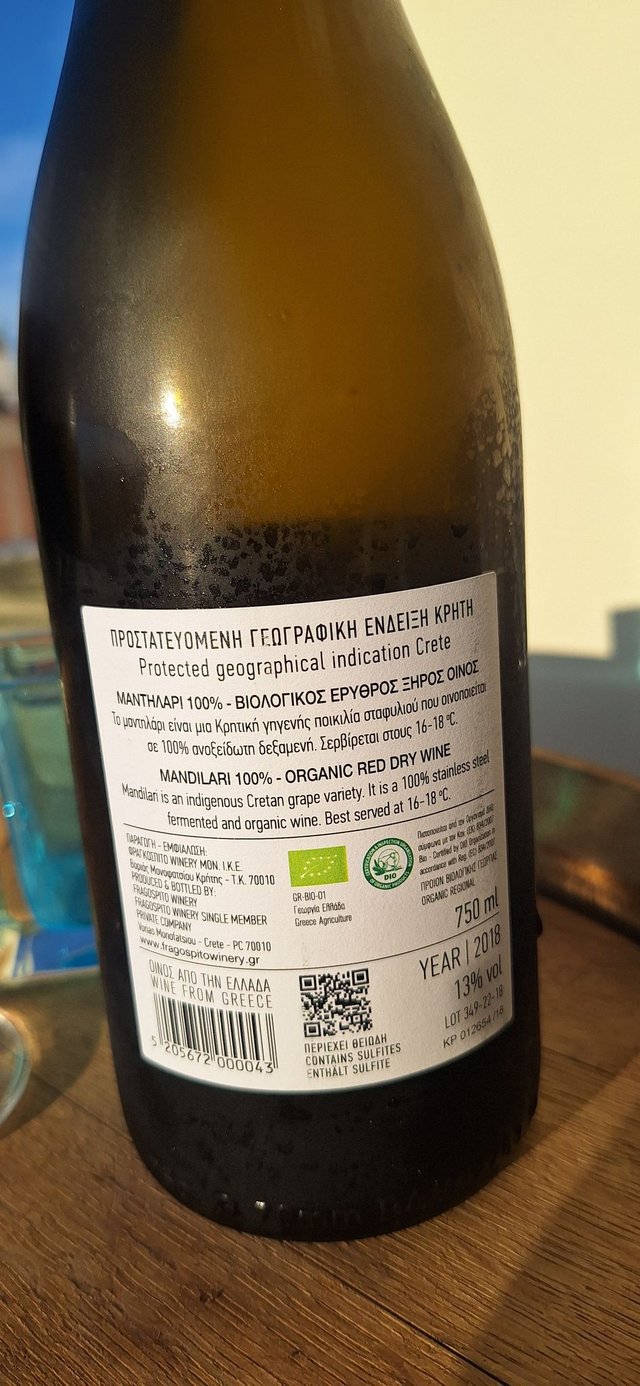 Cépage fier et têtu, le Mandilari est la mémoire sombre de la Crète. Cépage ancien et farouche, il offre des vins à la robe rouge profonde et aux tanins serrés qu’il faut du temps pour apprivoiser. Le millésime 2018 capture ses parfums de fruits mûrs et secs, de chocolat noir, d’épices chaudes et ce souffle presque animal, empreint de terre et de chaleur — malgré une couleur intense qui pourrait sembler hermétique.