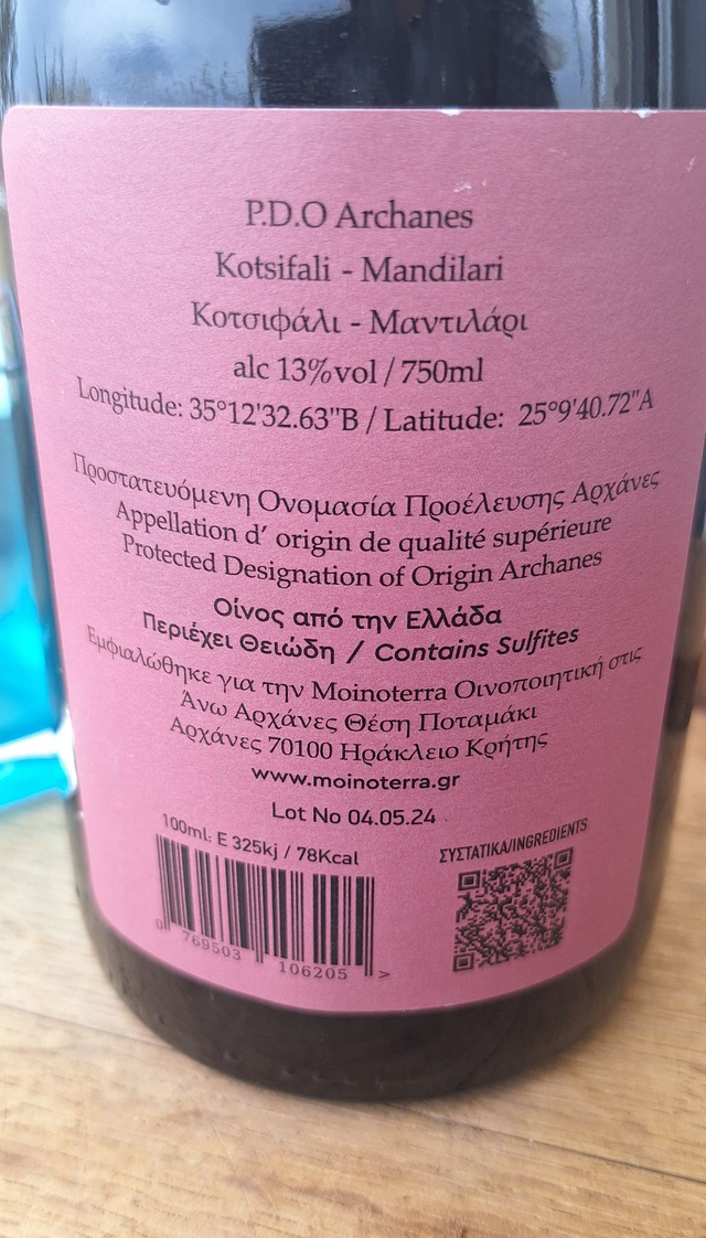 À quelques pas du site de Knossos, à 400–600 m d’altitude, le domaine Moinoterra de Nikos Stathoglou réunit histoire et modernité. Ce mélange Kotsifali (60%)-Mandilari (40%) est un hommage à la tradition viticole de l’AOP Archanes.